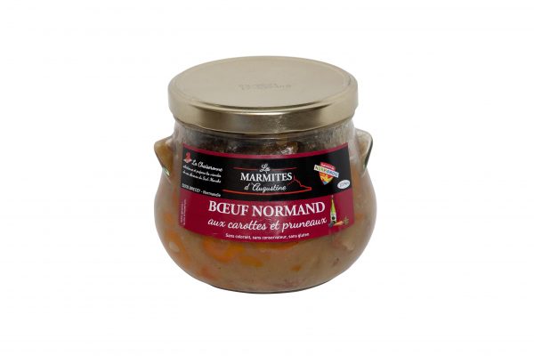 Labellisé « Saveurs de Normandie ». Pour 2 personnes. À réchauffer à feu doux pendant 8 minutes ou au micro onde pendant 3 minutes. Ingrédients: Viande de bœuf de Normandie (France) 42%, carottes 35%, bouillon de cuisson, jus de pomme fermenté Brécéen (SULFITES), pruneaux 5%, échalotes, crème d’Isigny AOP (LAIT), beurre (LAIT), farine de blé (GLUTEN), vinaigre (SULFITES) , sel, sucre, pommeau, poivre, muscade.