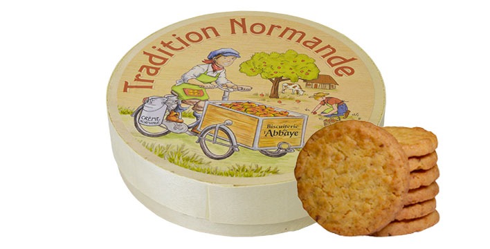 Boîte en bois contenant des sablés pur beurre aux pommes et à la crème fraîche d’Isigny A.O.P. Ingrédients: Farine de blé CRC®, sucre, beurre de Normandie 25,5%, crème fraîche d’Isigny AOP 5%, pommes séchées sucrées 2,7% [pommes 1,8% (équivalent à 6,9% de pommes fraîches), sucres extraits de fruits farine riz, acidifiant : acide citrique], jaunes d’œufs en poudre, arôme naturel de pomme, sel marin, lait écrémé, œufs entiers. Pommes origine France. Peut contenir des traces de fruits à coque, de soja et de graines de sésame.