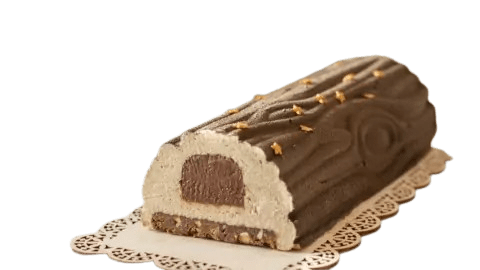 Bûche glacée La Cara’Choc : Le caramel fleur de sel maison est inséré dans la force du chocolat Grand Cru accompagné de cacahuètes et noix de pécan caramélisées. Bûche 8/10 personnes La Normande