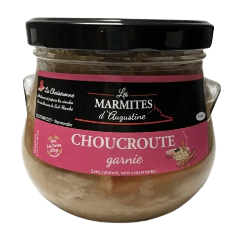 Recette traditionnelle à base de viande de porc (échine, saucisses, saucisson à l’ail, poitrine de porc fumée en lardons) accompagnée de choucroute cuisinée au Riesling. Pour 2 personnes. À réchauffer à feu doux pendant 8 minutes ou au micro onde pendant 3 minutes. Ingrédients : Viande de porc de Normandie (France) 46% (échine, saucisse de francfort, saucisse fumée, saucisson à l’ail, poitrine de porc fumée en lardons), choucroute cuisinée 39% [choucroute 95%, saindoux, oignons : Riesling, sel, baies de genièvre, arôme naturel de poivre, antioxydant E300], pommes de terre