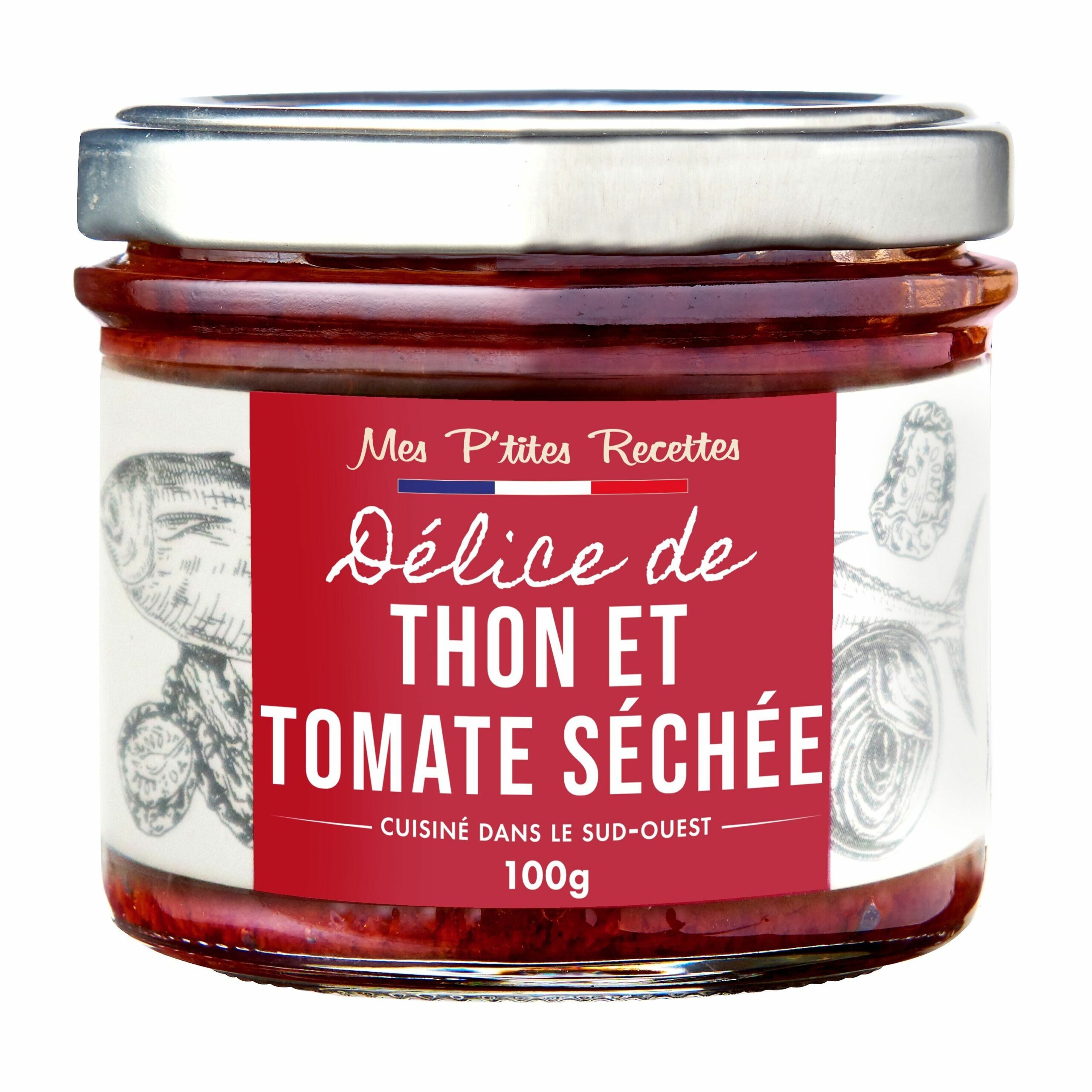 Spécialité à tartiner à base de thon et de tomates séchées Ingrédients: Thon au naturel 38%, tomates, double concentré de tomate, tomates séchées déshydratées 11%, carottes, oignons, purée de tomate, huile d’olive vierge extra, ail, poivre, sel, concentré