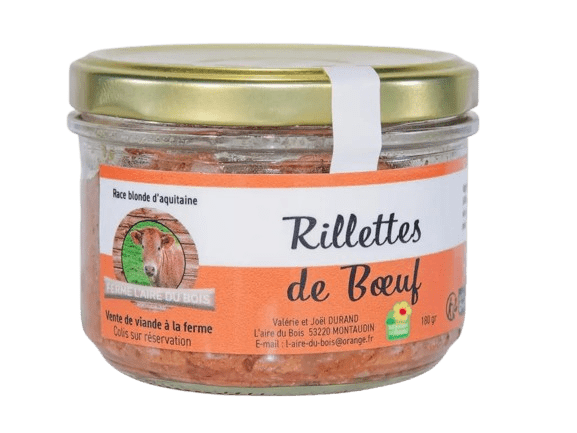 Pate et rillettes Ingrédients: viande de bœuf (68%) origine France, graisse de canard, sel de Guérande, poivre, laurier Produits de la Mayenne