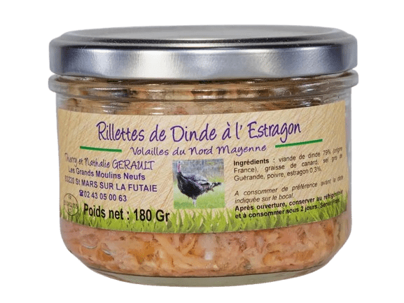 Ingrédients: viande de dinde 79%, graisse de canard, sel gris de Guérande, poivre, estragon 0.3%