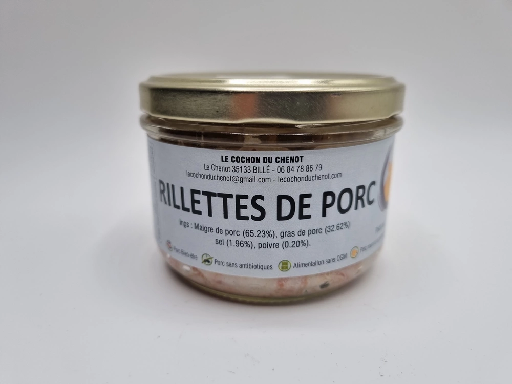 Pâtés et rillettes En direct de la ferme Ingrédients: maigre de porc (65.23%), gras de porc (32.62%), sel (1.96%), poivre (0.20%) Produits d’Ille et Vilaine/bretagne