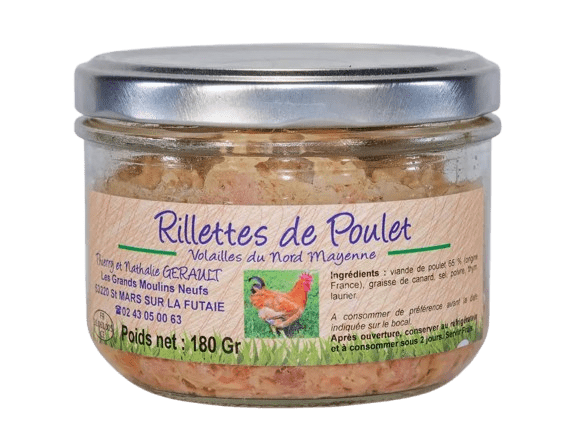 Paté et rillettes Ingrédients: viande de poulet 65%, graisse de canard, sel , poivre, thym, laurier Produits de la Mayenne