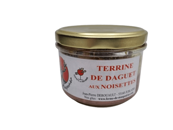 Pâtés et rillettes En direct de la ferme Ingrédients: Terrine de cerf aux noisettes – Viande de cerf (40%), porc, œufs, lait, oignons, calvados, gélatine, sel, épices, noisettes 7% Produits de la Mayenne